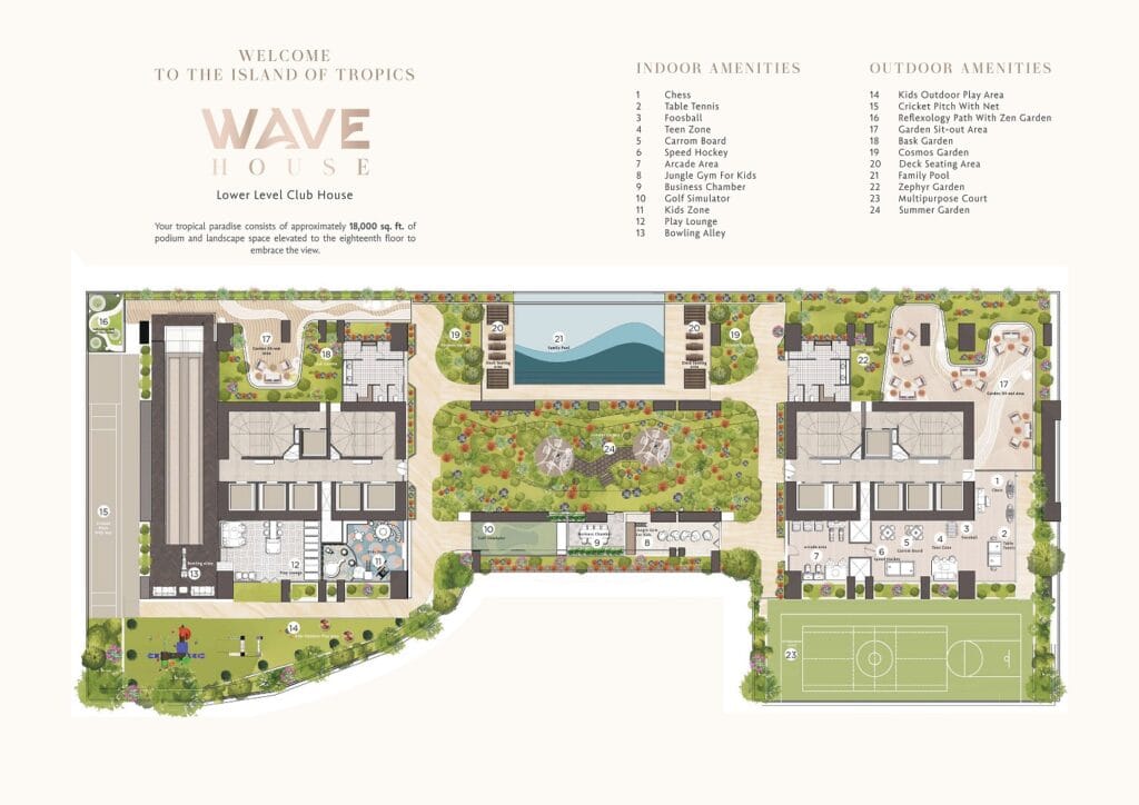 Aaradhya Avaan elevates luxury with world-class amenities designed to cater to every aspect of modern living. On the 18th level, the Wave House (18,000 sq ft.) is a haven of recreation, featuring:
