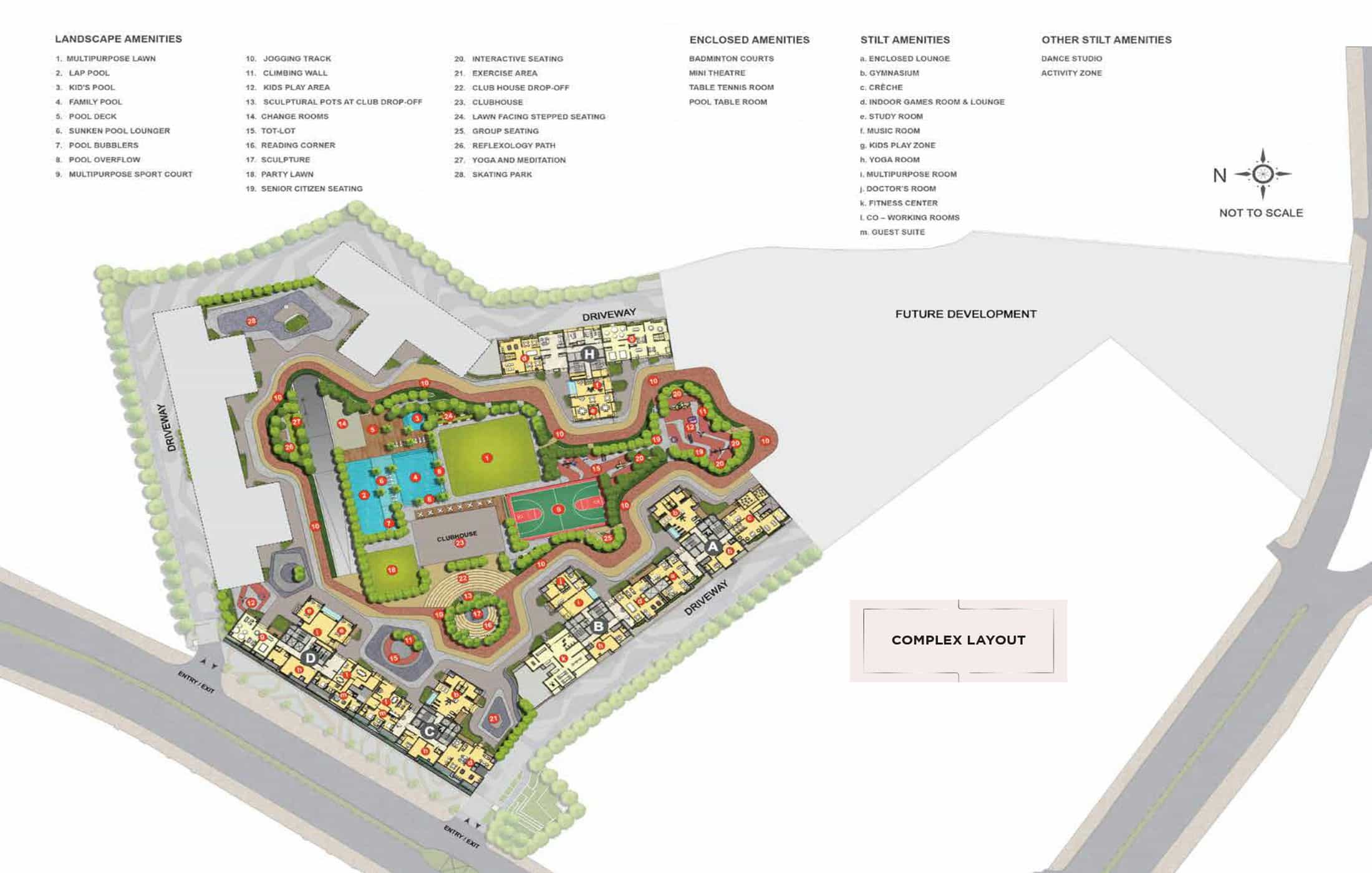 Kalpataru Srishti Namaah offers over 40 world-class amenities catering to all age groups. Stay active with a multipurpose court, jogging track, and state-of-the-art gymnasium. Children can enjoy the dedicated play area and splash pool, while adults can relax at the clubhouse or explore their creativity in the dance studio. Unique features like a climbing wall and skating park add a fun, community-driven vibe to the project. Additional amenities include a yoga lawn, amphitheatre, and beautifully landscaped gardens, ensuring a balanced and fulfilling lifestyle.