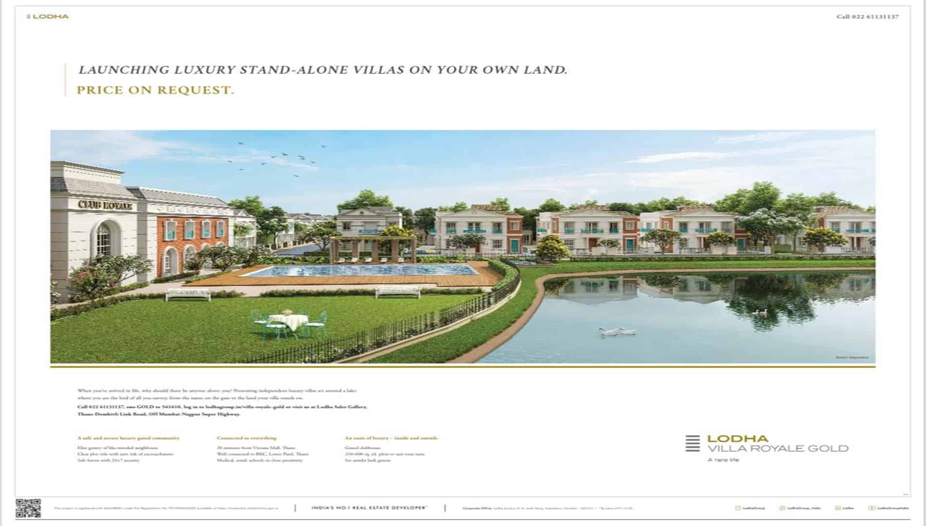 Immerse yourself in a lifestyle defined by exclusivity. LODHA VILLA ROYALE offers a rarefied living experience, where each residence is a manifestation of unparalleled luxury. From meticulously designed interiors to breathtaking views, every element has been curated to elevate your living experience.
